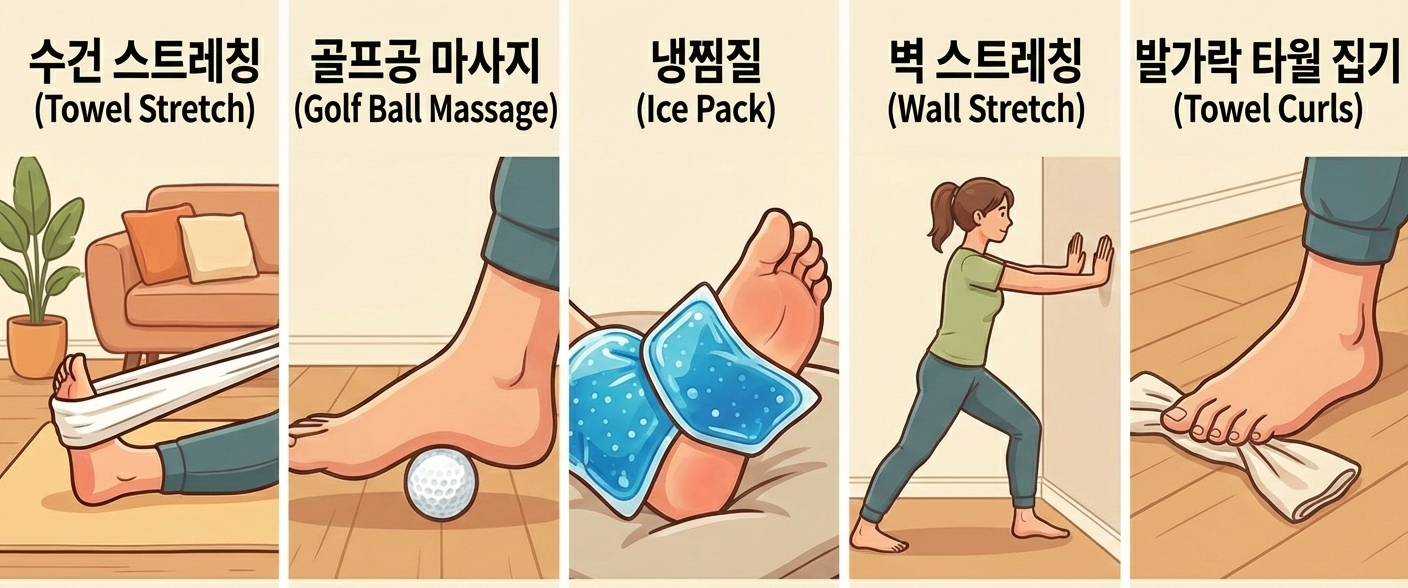| 수건 스트레칭 | 앉아서 수건으로 발바닥을 감싸고 몸 쪽으로 천천히 당기기 (20초 x 3회) |
