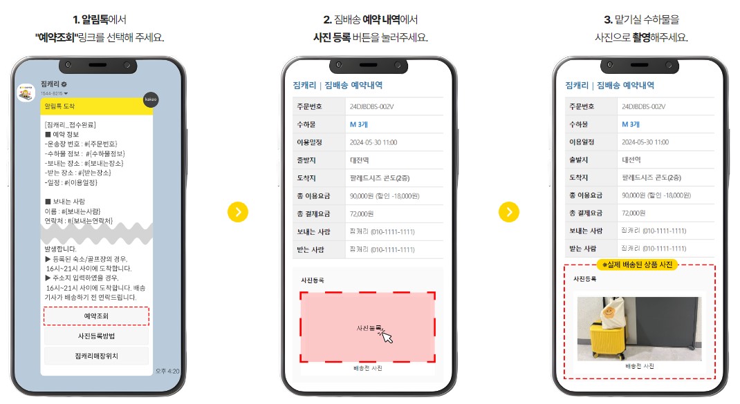 * 예약 후 예약조회 링크에서 사진을 등록해야 주소지 확인/가방 파손등의 자료가 되므로 사진 미등록으로 접수가 취소될 수 있습니다.