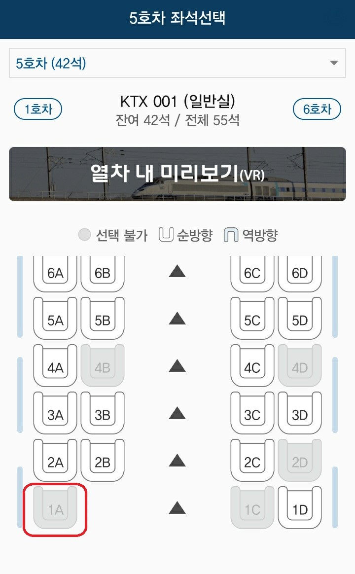5호차 좌석 중에서도 1A의 좌석은 옆자리가 없어서 인기가 가장 많은 좌석이니 참고하셔서 예매하시기 바랍니다.